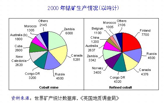 钴和其他许多贱金属一样,现货市场价格在过去30个月里持续下降,从1999年5月每磅20美元以上跌至每磅10美元以下。在历史上,钴价波动较大。在1979年前扎伊尔沙巴省发生动乱期间,钴价在数周之内激增三倍。当时扎伊尔约占全球供应量的一半。现在,钴生产在地域上远没有以前集中。但从中、短期来看,需求仍趋于缺乏价格弹性。只要认为可能出现供应问题,价格仍可能迅速倍增。