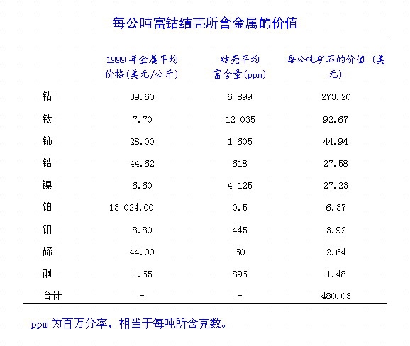 除钴之外,结壳还是其他许多金属和稀土元素的重要潜在来源,如钛、铈、镍、铂、锰、磷、铊、碲、锆、钨、铋和钼。结壳由水羟锰矿(氧化锰)和水纤铁矿(氧化铁)组成。较厚结壳有一定数量的碳磷灰石,大部分结壳含少量石英和长石。结壳钴含量很高,可高达1.7%;在某些海山的大片面积上,结壳的钴平均含量可高达1%。这些钴的含量比陆基钴矿0.1%至0.2%的含量高得多。在钴之后,结壳中最有价值的矿物依次为钛、铈、镍和锆。