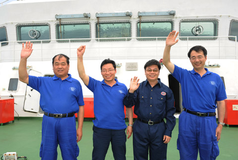 1,蛟龙号海试总指挥刘峰(左二)、“海洋六号”船首席科学家杨胜雄(右二)、海试临时党委书记刘心成(左一)等科学家在船甲板上合影。