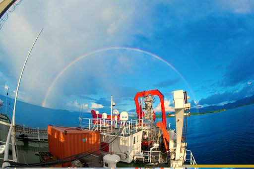 当地时间8月31日下午5时,“向阳红09”船在瓢泼大雨中起锚,缓缓离开波纳佩港。不一会儿,雨过天晴,两道彩虹横空出现,似在欢送蛟龙号离港,预祝第三航段试验成功。