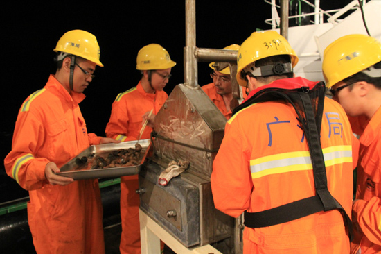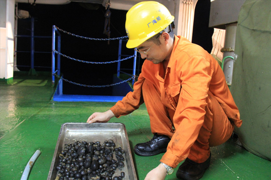 大洋29航次海洋六号在5500米海底打捞出多金属结核样品
