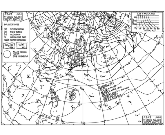 11月1日地面分析图显示,20号热带风暴加强为台风