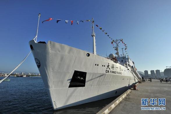 当日,执行我大洋科考第34航次任务的“大洋一号”船从海南三亚起航。据悉,大洋34航次计划时间219天,航程约2万海里,分5个航段,预计2015年6月22日返回青岛,将在我国硫化物勘探区进行多金属硫化物资源勘探、环境基线调查、生物资源调查以及在印度洋海盆进行稀土资源侦查性调查等科学考察。新华社发(杨冠宇摄)