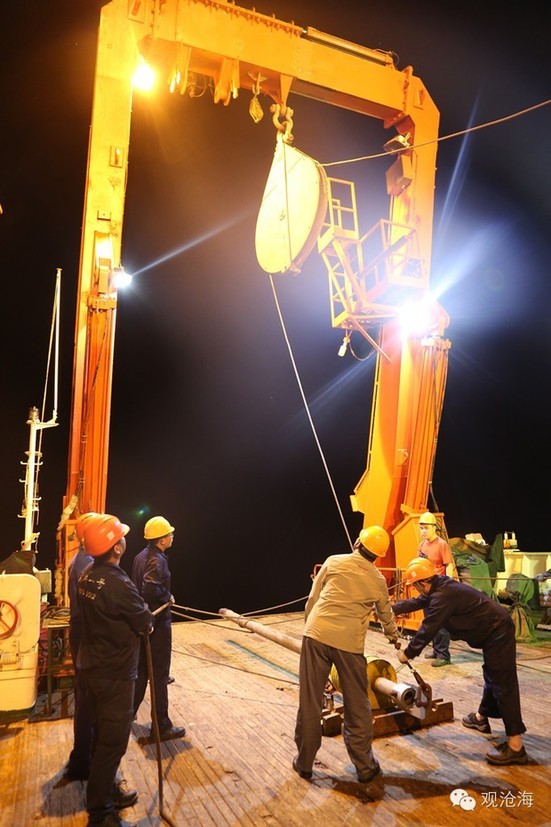 23时18分,重力柱取样器露出水面。科考队员借助滑轮和钢缆的力量将重力柱取样器回收至后甲板上。杨刚、陈颢等迅速用缆绳将重力柱取样器固定,然后小心翼翼地取出样柱,并进行封存处理。经过测量,此次作业获取的样柱为2.60米。重力柱取样作业圆满结束。