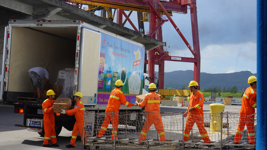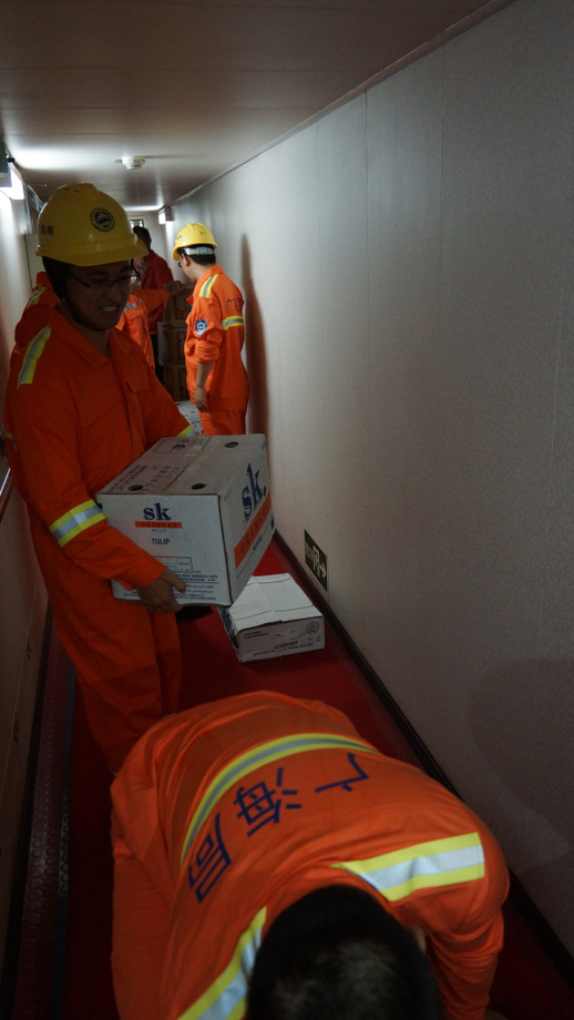 早上9点,第二批补给货品上船。从码头到甲班到厨房冷库,海洋六号全体人员排成一列做搬运接力。东西很沉,但内心的喜悦都挂在脸上。这是本次靠港以来最大也是最后一次进货。