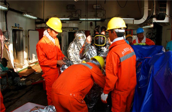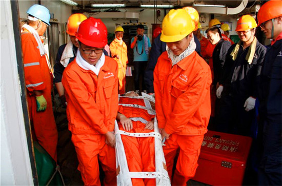 队员回到船舱后不久,乱铃加四短警报再次拉响,这一次的消防演练模拟机舱失火,有了一次演习经验的科考队员们拿着湿毛巾、戴好安全帽,鱼贯而出走到后甲板上,积极待命。船员各司其职,排除“险情”。探火员迅速进入机舱“扑灭”不大的火势。“报告轮机长,火势不大已被扑灭,未造成更大损失”,穿着消防员装备的探火员向现场指挥轮机长报告道。模拟救助伤员也同时展开,只见伤员被迅速固定在担架之上,由四名船员将其抬出,接受救援。
