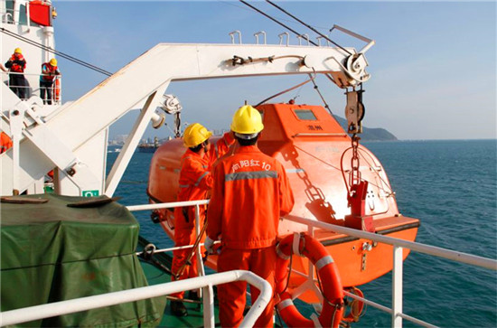 随着七短一长鸣笛警报的拉响,“向10”进入了“备战状态”。全体队员、船员迅速穿好救生衣、戴好安全帽,携带浸水保温服到艇甲板集合,列队点名,听候安排。在短暂的忙乱之后,全体科考队员及船员迅速就位、点名,秩序井然地进入到救生艇,并进行施放救生艇操作。“向10”船的船长站在驾驶台做演习总指挥,通过对讲机与船员进行指挥沟通,随着一声声“队员集结完毕”“救生艇检查完毕”等报告,有条不紊地进行安全演练指挥。