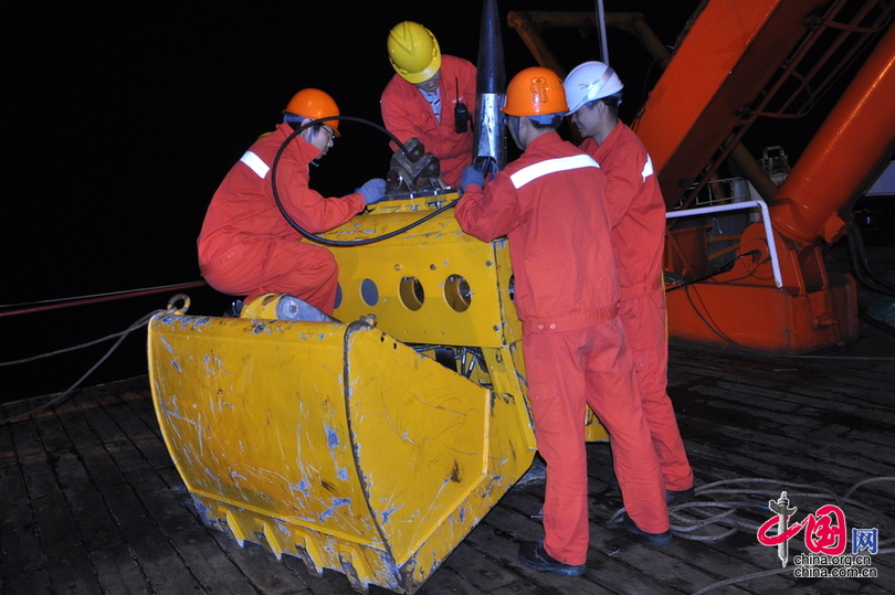 (特派记者 葛蕾) 随着“潜龙二号”第二航段第二次下潜成功归来,科考队员紧接着连夜开始了本行段的第二次、第三次电视抓斗(TVG)作业。