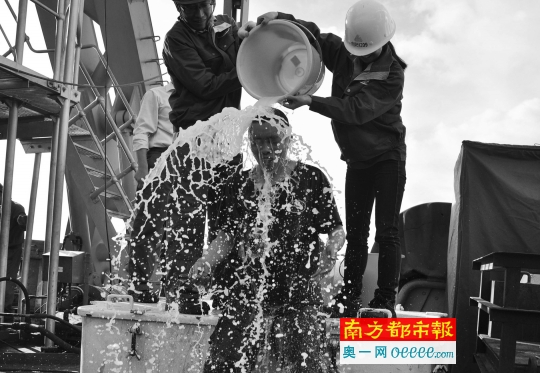 4月30日,广州海洋地质调查局高级工程师姚会强在结束他首次随“蛟龙”号的下潜后接受“泼水礼”。 新华社图
