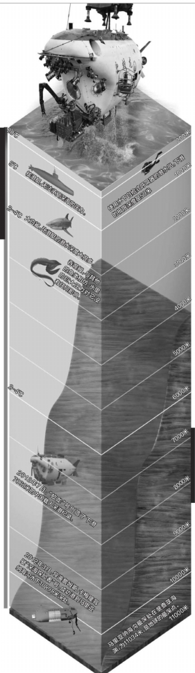 “蛟龙”号是第一台由我国自行设计、自主集成研制的载人潜水器。其设计最大下潜深度是约7000米,工作范围可以覆盖全球海洋区域的99 .8%,代表着深海高技术领域的最前沿。2012年7月,“蛟龙”号在马里亚纳海沟试验海区创造了下潜7062米的中国载人深潜纪录,同时也创造了世界同类作业型潜水器的最大下潜深度纪录。“蛟龙”号具备深海探矿、海底高精度地形测量、可疑物探测与捕获、深海生物考察等功能。