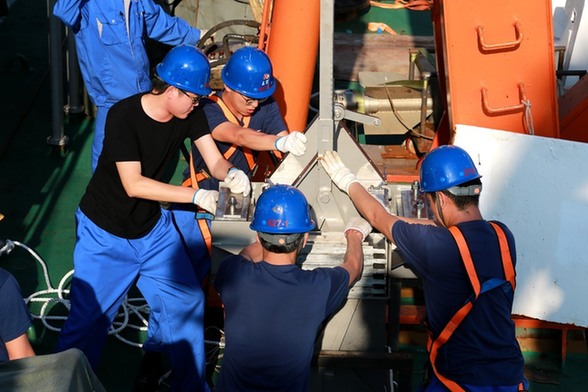 13时许,一名科考队员操作绞车,将钢缆穿过吊臂,与箱式取样器连接。4名队员用止荡绳拴住箱式取样器把手,两名身穿安全绳的队员拉开船舷上的侧门,所有人一切准备就绪。