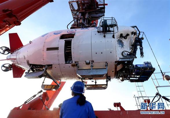 5月25日,刚从深海归来的“蛟龙”号。当日,“蛟龙”号载人潜水器在马里亚纳海沟成功找到一年前因特殊情况留在了6300米大洋深处的采水器,“大海捞针”的故事变为现实。新华社记者刘诗平摄