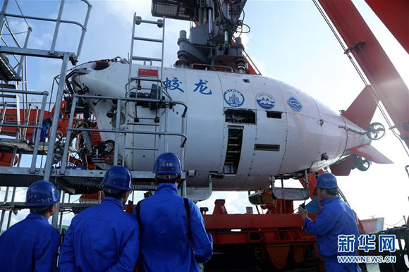 6月1日,“蛟龙”号载人潜水器深潜归来,工作人员在将其回收至“向阳红09”科学考察船甲板。