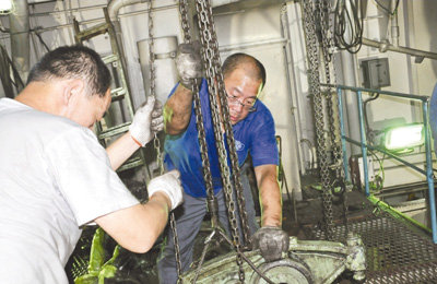 “老轨”刘军(右)在“向阳红09”船的机舱内工作。(国家海洋局北海分局供图)