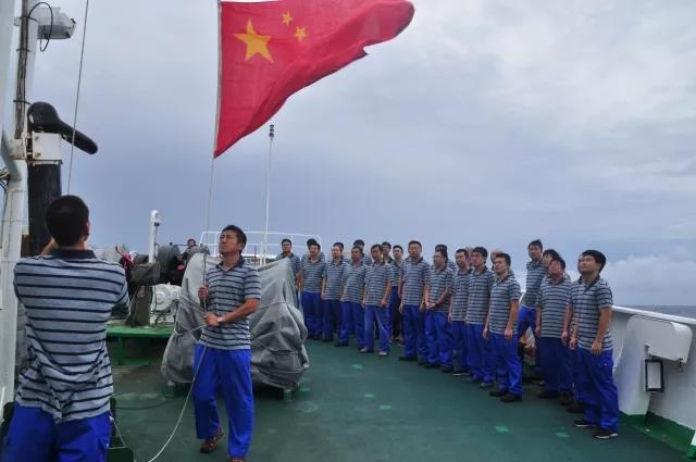 “望着冉冉升起的五星红旗,远离祖国的我们无比激动。在今天这样一个特殊的日子里,闯荡大洋的我们,用升国旗的方式表达我们对祖国的祝福。国旗中有我们的信仰,有我们的使命与责任。祝愿祖国繁荣昌盛!”