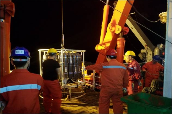 2017年12月23日深夜23时(东三区),大洋49航次第一航段的第一站CTD作业,水文组、化学组、生物组都在翘首相盼,等待即将回收的24个采水瓶中的水样。然而当CTD回收至1400米水深时,软件显示7号采水瓶之后的所有采水瓶均不能触发,采水器故障。船上没有更换的CTD采水器备件,如采水器故障不能修复,那么将影响到第一航段后续的CTD采水任务。