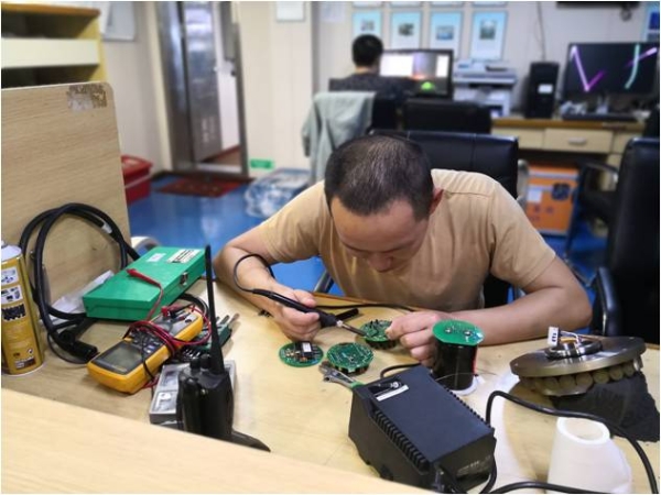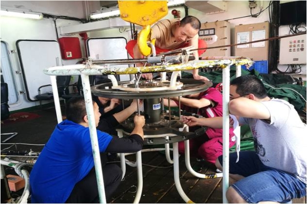 经过一天一夜的故障排查,基本确定为采水器控制舱内部电路故障导致采水器无法触发。此类型进口的CTD采水器控制舱,国内几乎从未有人将其拆解维修过,通常仅仅是找出故障原因进而更换备件。再困难也得上,再棘手也得干,经首席科学家与岸基保障组的会商,反复慎重研究决定,拆解维修!四个平均年龄不到30岁的小伙子,展开尝试,在岸基保障组共同的技术协助下,研究图纸、分解拆卸、电路诊断,经过三天的埋头苦干,终于找出控制舱内部故障并将其修复,并最终顺利完成了第一航段的CTD任务。