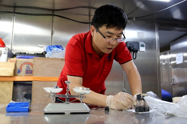 在实验室的另一侧,第二综合作业组组长高伟也在紧张忙碌着。先是把沉积物样品放进圆形的环刀,测量沉积物的体积。之后,又把样品放在电子秤上称重,记录样品的含水量等数值……