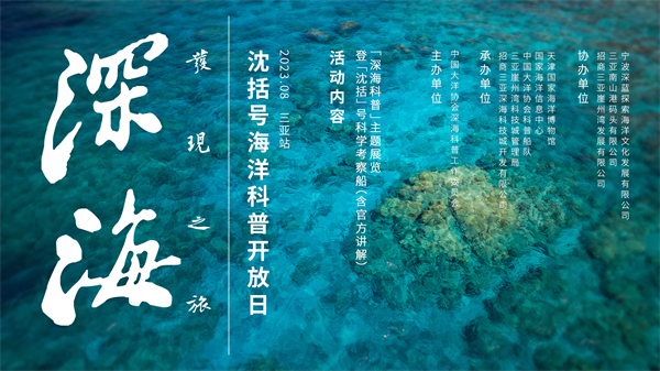 本次开放日由中国大洋协会指导,中国大洋协会深海科普工作委员会主办,国家海洋博物馆、国家海洋信息中心、中国大洋协会科普船队、三亚崖州湾科技城管理局、招商三亚深海科技城开发有限公司承办,宁波深蓝探索海洋文化发展有限公司、三亚南山港码头有限公司、招商三亚崖州湾发展有限公司协办。